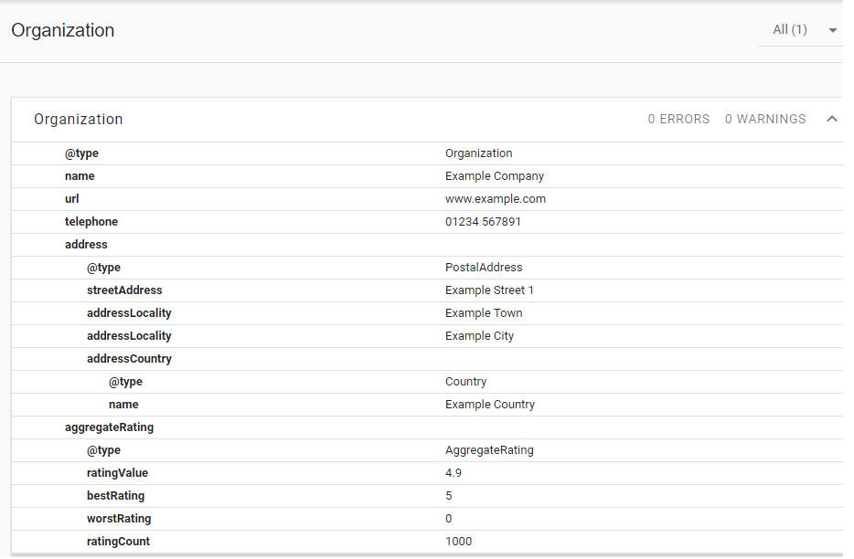 <script type = "application / ld + json"> {"@context": "http://schema.org", "@type": "Організація", "назва": "Приклад компанії", "url": "http://www.example.com", "логотип": "http://example.com/image.png", "адреса": {"@type": "PostalAddress", "streetAddress": "1 Приклад вулиці "," адресаЛокальність ":" Приклад міста "," адресаРегіон ":" Приклад регіону "," PostalCode ":" EX12 345 "," addressCountry ":" Великобританія "}," contactPoint ": {" @type " : "ContactPoint", "contactType": "служба підтримки користувачів", "телефон": "01234 567891", "email": "[email protected]"}, "aggregateRating": {"@type": "AggregateRating", "ratingValue": "введіть оцінку", "ratingCount": "введіть кількість відгуків"}} </script>Коли ви запускаєте сторінку за допомогою інструмента тестування, ви побачите такі поля без помилок: